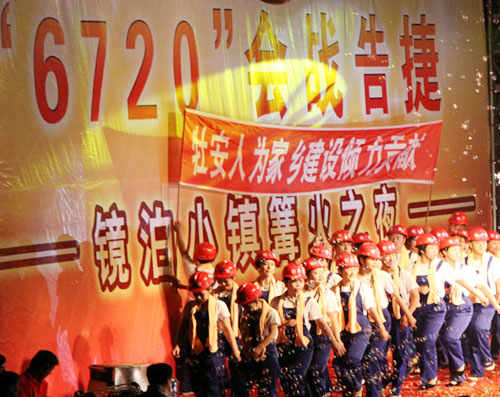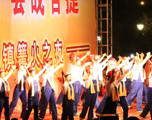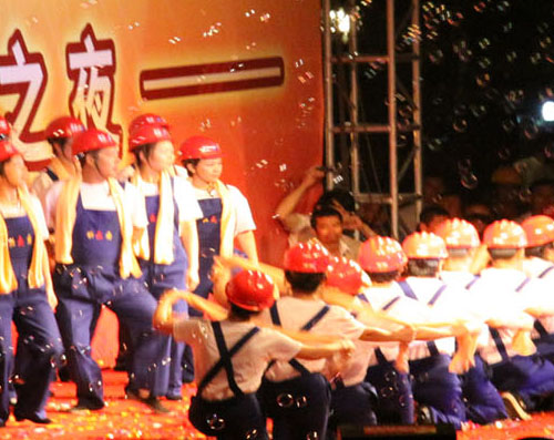 開業(yè)當(dāng)晚,我公司代表施工企業(yè),為“鏡泊小鎮(zhèn)篝火之夜”文藝匯演奉獻了節(jié)目——舞蹈《咱們工人有力量》。